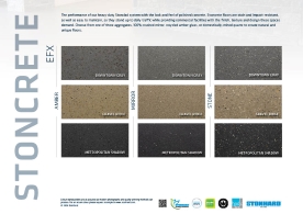 Stoncrete EFX is a trowelled, epoxy mortar system that has the look and feel of Polished Concrete, but with longer lasting durability and performance. It is the ideal choice for retail stores, lobbies, cafeterias, restaurants and corridors. Stoncrete EFX can be used for new flooring or to resurface an existing floor (e.g. damaged polished concrete). Stoncrete EFX's attractive design is available in five base colours and three unique decorative aggregates. The aggregate choices consist of 100% mirror glass, a blend of recycled amber glass, and domestically-mined quartz. Available in matte, satin or semi gloss finish. Love Polished Concrete? You’ll love this more.